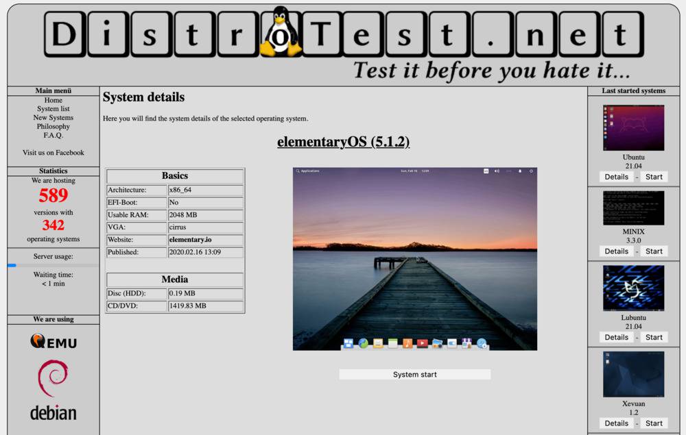 Maintenant, si vous voulez essayer l’une de ces distributions Linux sans vous prendre la tête, je vous invite à aller sur DistroTest qui propose des machines virtuelles Linux qui se lancent directement dans le navigateur sans programme d’installation et qui vous permettront d’expérimenter tous les OS que je viens de vous présenter et bien plus encore.